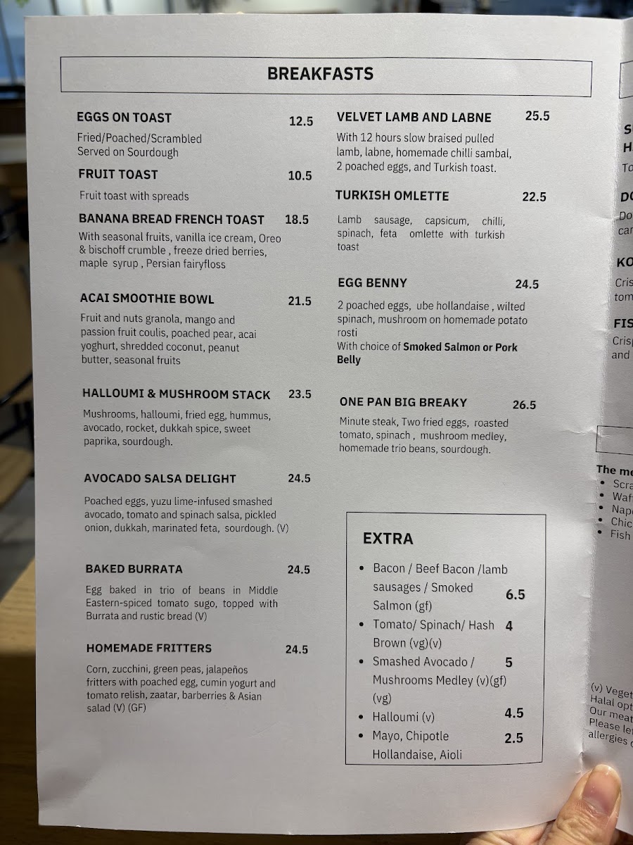 Hash brown, two fried eggs, lamb sausages, roasted tomato, spinach, mushroom medley, sourdough. Add bacon or beef bacon for an additional charge.
